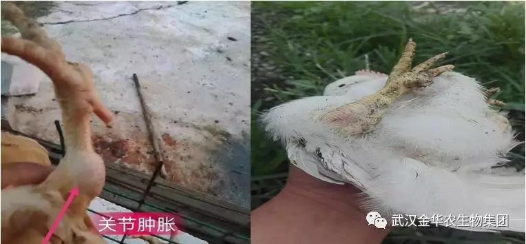 劉姐開始用替米考星加上鹽酸多西環素用了10天,效果不理想,后來加了4天強力霉素和泰勒菌素,癥狀減輕但是腫脹依舊明顯,出現了越來越多的癱雞,極度消瘦,精神沉郁的病雞。劉姐晚上翻來覆去睡不著,翻閱網上各種資料,后來看到有一個產品叫“滑囊藍金”方案還不錯,就抱著試試的態度在網上找到了華中農業大學校企合作單位---武漢金華農生物科技有限公司,禽病技術專家姚教授、趙教授確診為滑液囊支原體后推薦劉姐使用“滑囊藍金”方案。連用7天一療程。