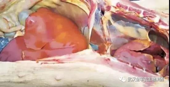 4、全身黃疸,慢性病例皮下黃染,解剖內臟有黃染。