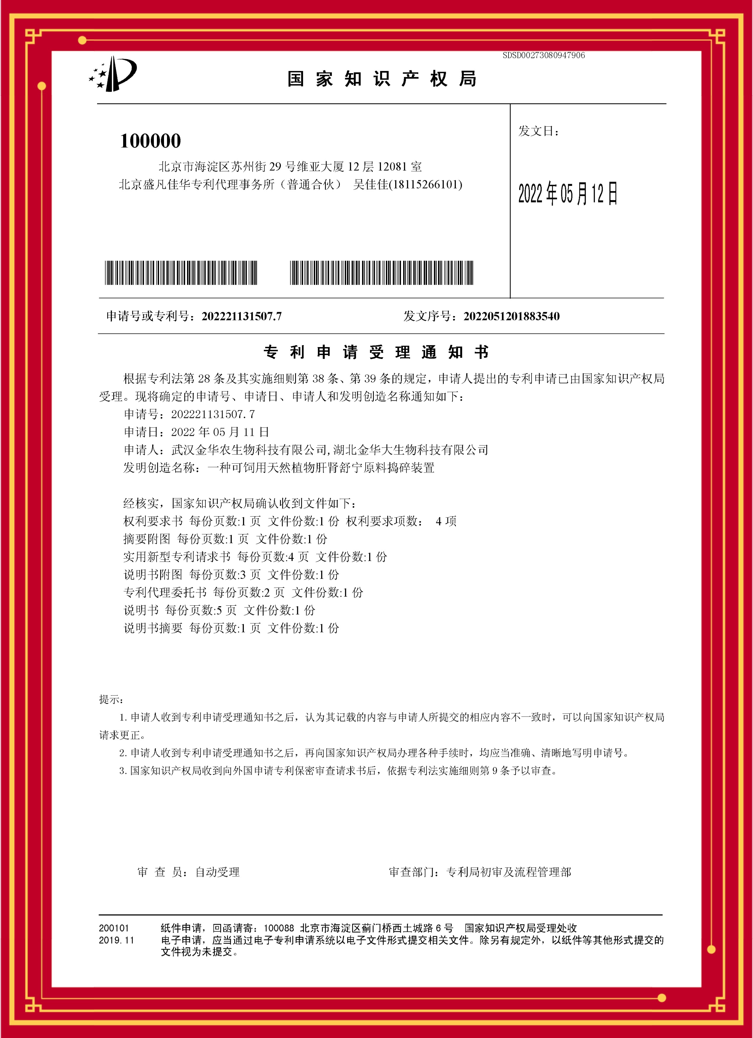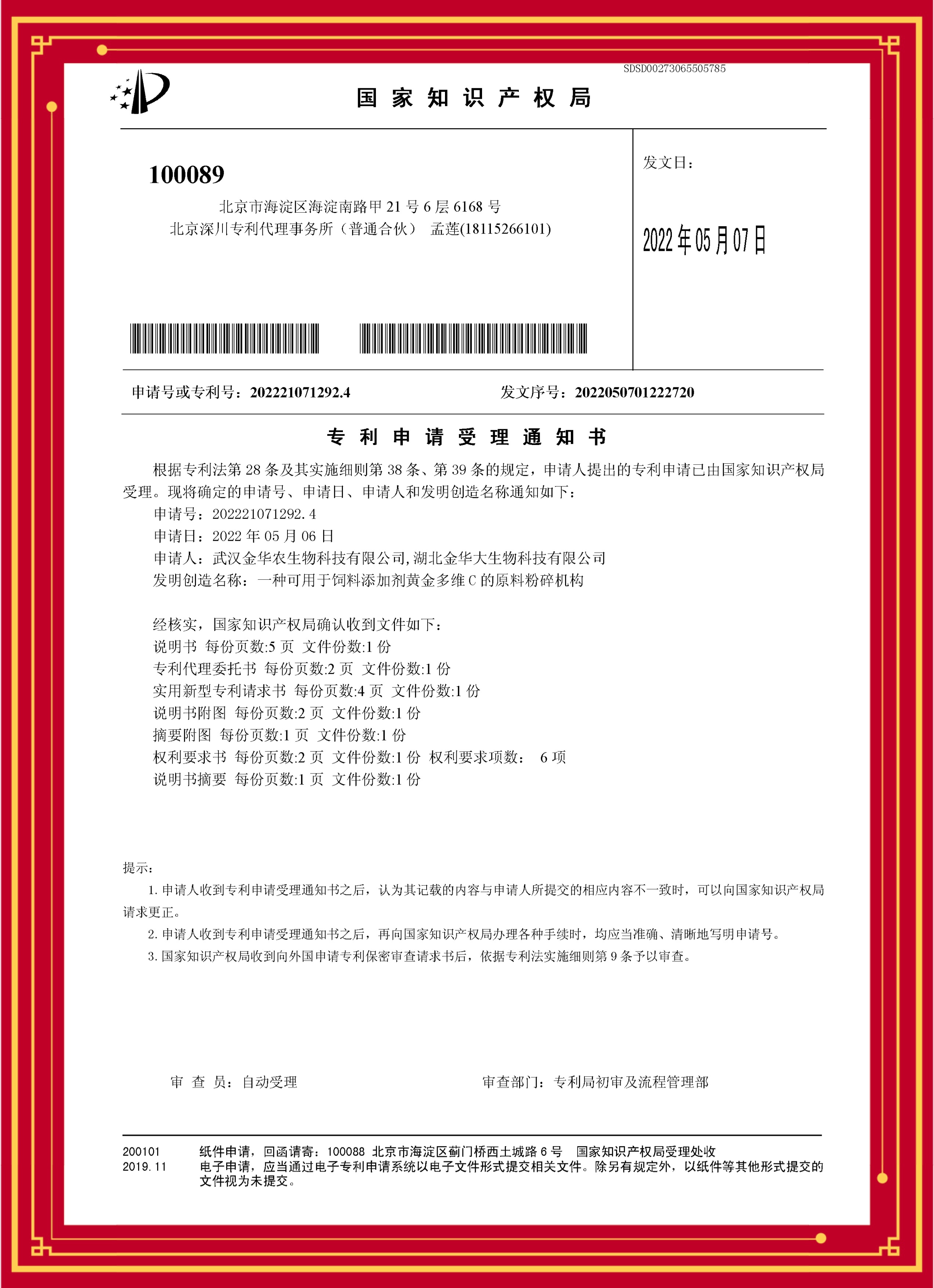 ? ? 繼“優(yōu)樂肽、快速壯、氟泰肺寧、藍(lán)圓瘟毒克、高熱病毒靈、金替呼諾”產(chǎn)品榮獲專利證書后,近日,武漢金華農(nóng)又一批拳頭產(chǎn)品獲得專利證書。產(chǎn)品“伊苯佳、黃金多維C、肝腎舒寧、弓球痢康、金普西林”5項目科技發(fā)明獲得國家榮譽專利,《一種家禽養(yǎng)殖用殺蟲劑伊苯佳配制長效裝置》,專利號:202221076567.3;《一種用于飼料添加劑黃金多維C的輔料原料粉碎增效機構(gòu)》,專利號:202221071292.4;《一種可飼用天然植物龍膽護(hù)肝素肝腎舒寧原料搗碎裝置》,專利號:202221131507.7;《一種獸藥生產(chǎn)用弓球痢康粉劑包裝機》,專利號:202221108553.5;《一種生產(chǎn)獸藥金普西林用的快速分散旋轉(zhuǎn)擠壓混合設(shè)備》,專利號:202221407935.8,獲得國家知識產(chǎn)權(quán)局授權(quán),并獲得專利受理證書。