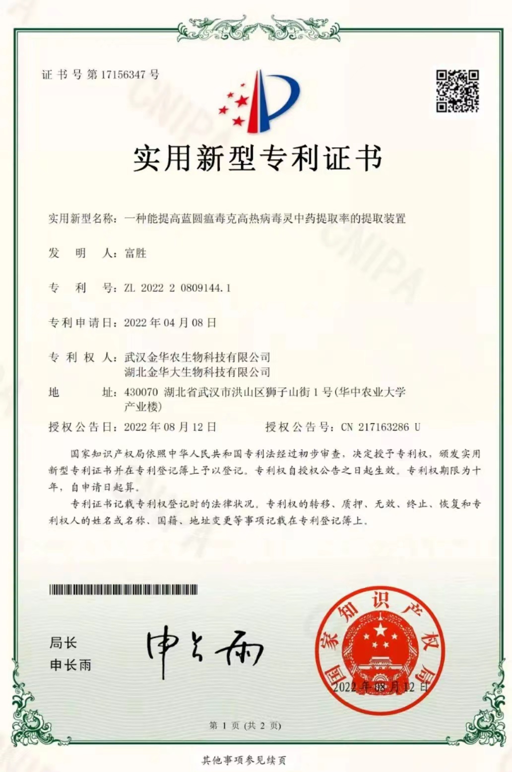 科技專利證書(藍圓瘟毒克):專利號—202220809144.1