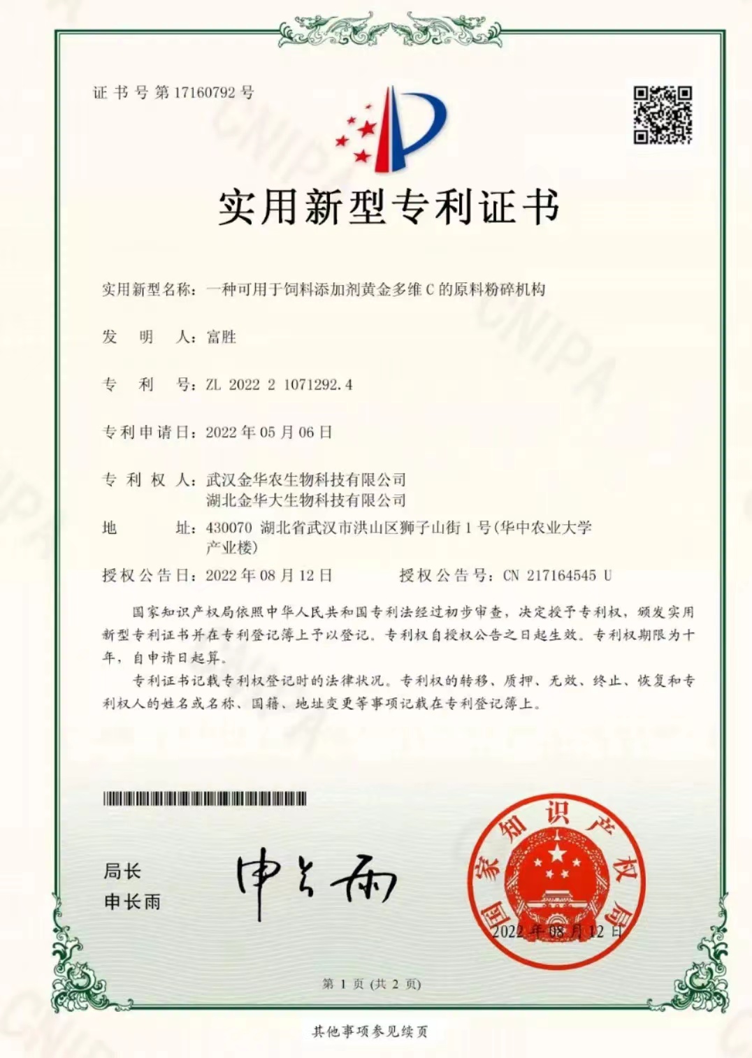 科技專利證書(黃金多維C):專利號—202221071292.4