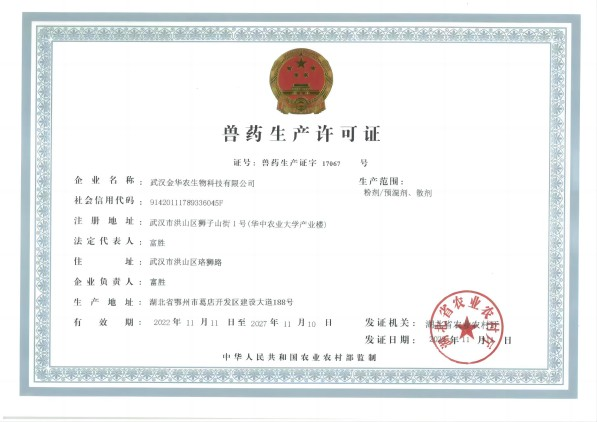 武漢金華農獸藥生產(chǎn)許可證號:獸藥生產(chǎn)證字17067號