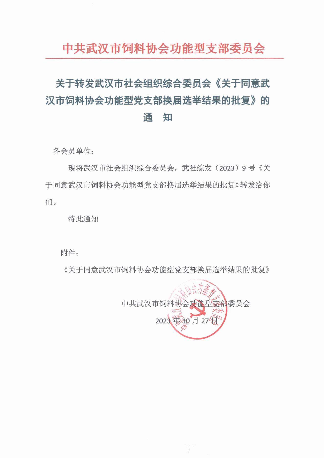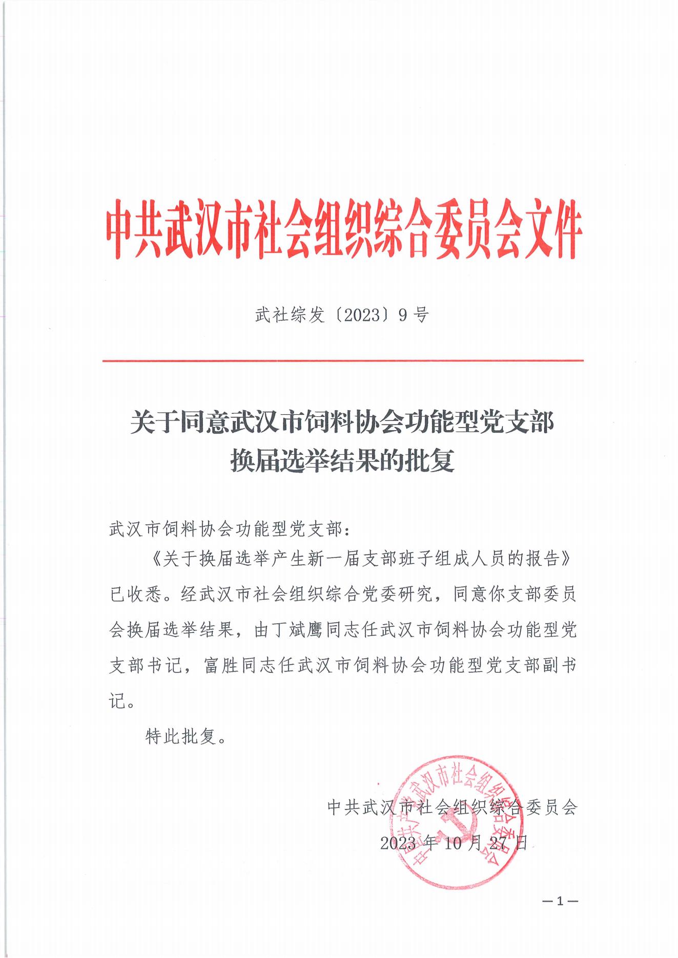 ? ? ? ?會議下發了關于武漢市飼料協會功能型黨支部換屆選舉結果的批復。經武漢市社會組織綜合黨委研究,同意武漢市飼料協會黨支部委員會換屆選舉的結果,由丁斌鷹同志任武漢市飼料協會功能型黨支部書記,富勝同志任武漢市飼料協會功能型黨支部副書記。