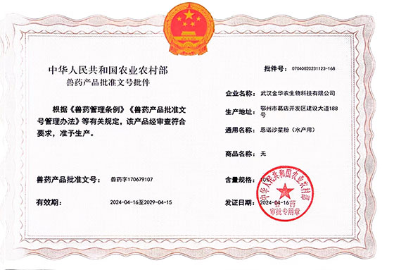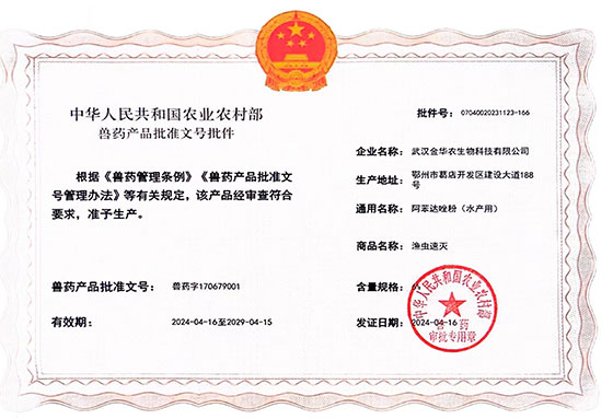 根據《獸藥管理條例》和《獸藥產品批準文號管理辦法》的規定,經農業農村部審查,準予核發武漢金華農生物科技有限公司2個新版GMP水產漁藥相關產品批準文號。