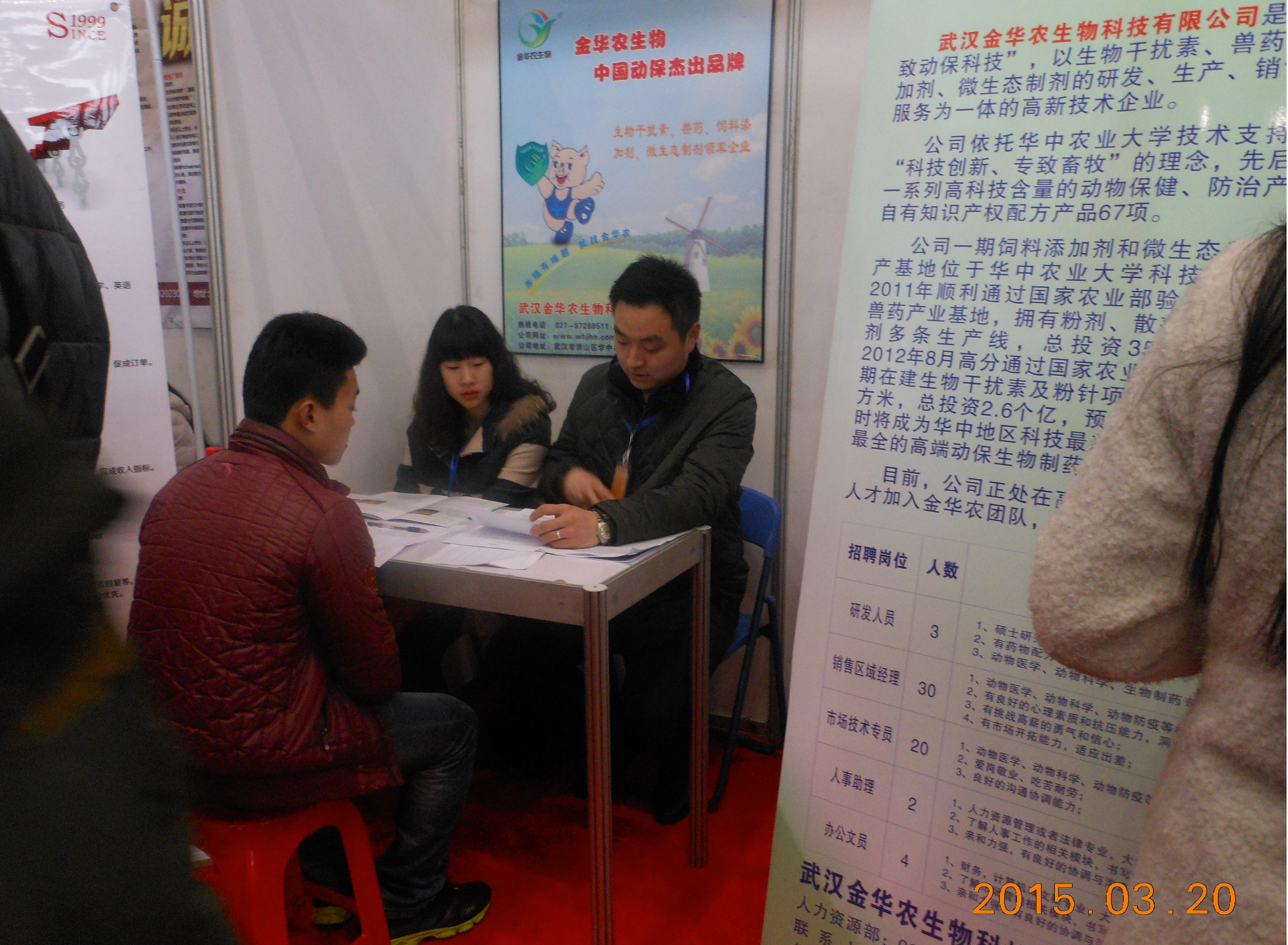 3月20日,華中農(nóng)業(yè)大學(xué)舉行2015屆畢業(yè)生春季供需見面會,4500余名高校學(xué)子參加了現(xiàn)場見面會。武漢金華農(nóng)生物應(yīng)邀參加,攜5大種類共65個崗位高校攬才。