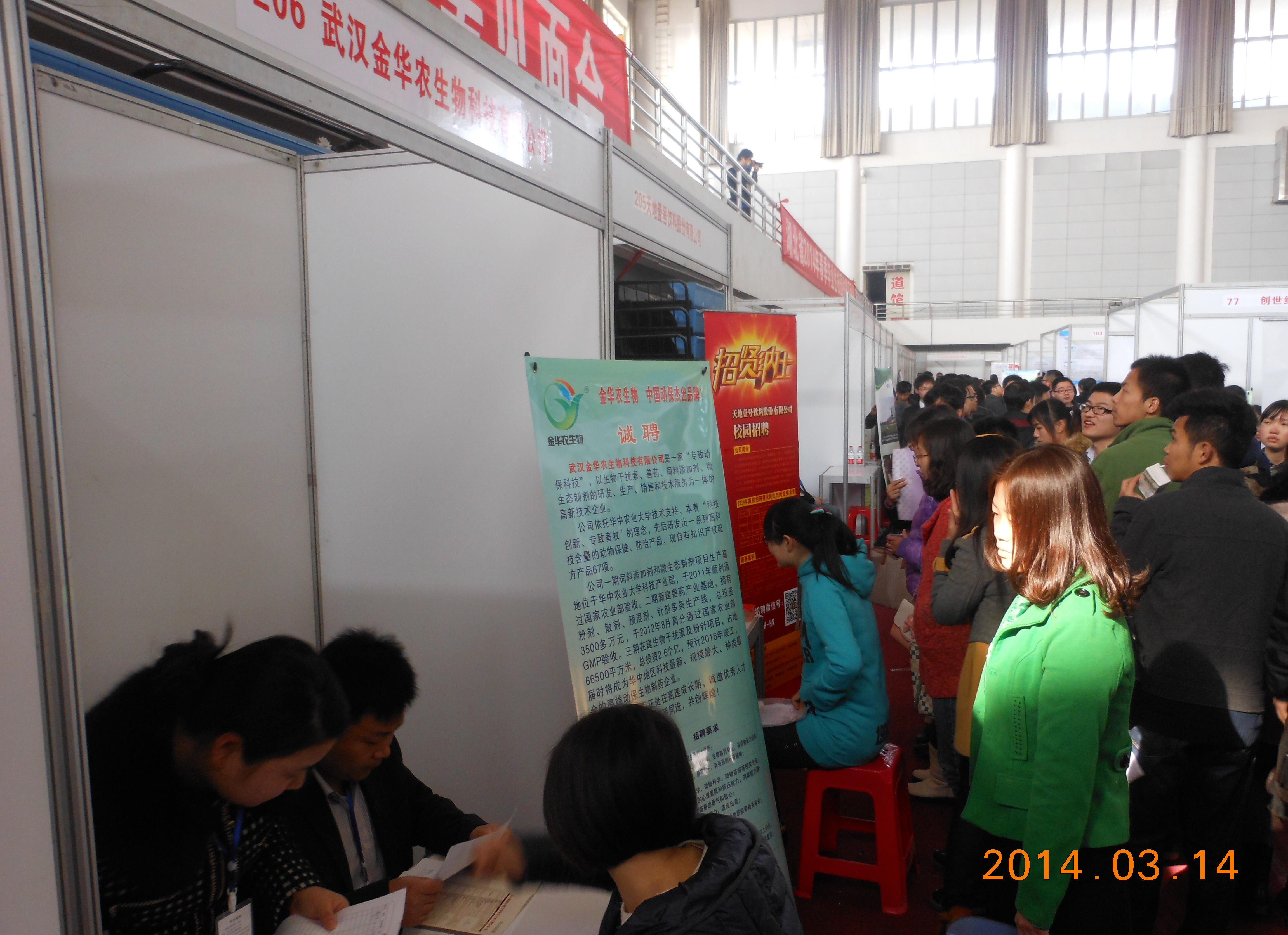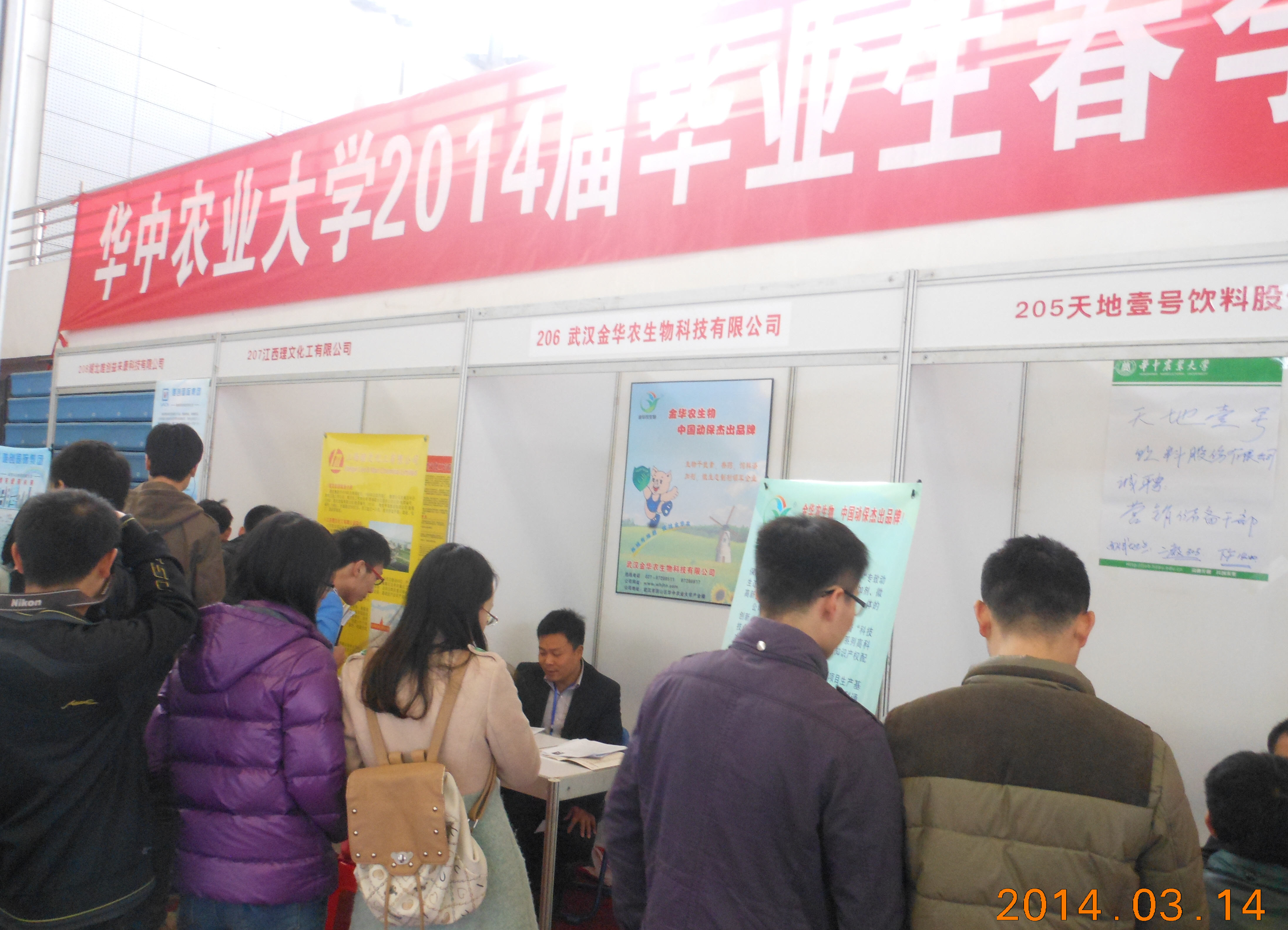 14日,華中農業大學舉行2014屆畢業生春季供需見面會,4850余名來自該校及附近高校的畢業生參加了現場見面會 。應華中農業大學學生工作處、華中農業大學科技處的邀請,武漢金華農生物隆重出席了此次招聘會,為公司的高速發展再次招攬優秀人才。