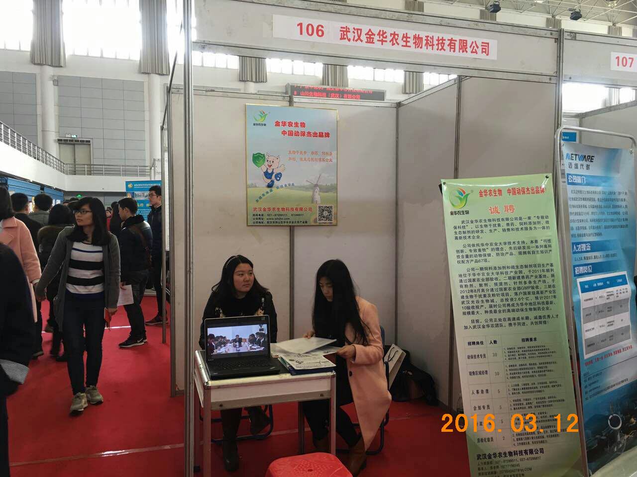 2016年3月12日,由湖北省高校畢業(yè)生就業(yè)指導(dǎo)服務(wù)中心和華中農(nóng)業(yè)大學(xué)共同舉辦的2016屆畢業(yè)生春季供需見(jiàn)面會(huì)在學(xué)校體育館舉行,5000余名高校學(xué)子參加了現(xiàn)場(chǎng)見(jiàn)面會(huì)。武漢金華農(nóng)生物應(yīng)邀參加,攜8大種類共66個(gè)崗位高校攬才。