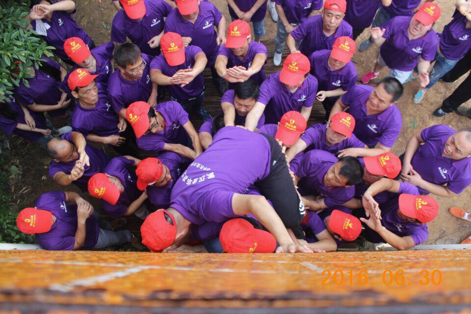 “金華農,加油!金華農,加油!金華農,必勝!金華農,必勝!……”踏著李奔、陳維利、劉傳忠、曹玉廣、唐友琦、王海峰、陳進調組成的第一層、第二層“人梯”,我們的團隊開始往上爬,風雨交加,墻面很滑,踩過兩道“人梯”,公司綜合辦主任黃凡第一個躍過墻面,回過頭來,他開始構建“頂層”防線,一個、兩個、三個……越來越多的人在隊友的幫助下,成功翻越,我們的目標,是不落一人。